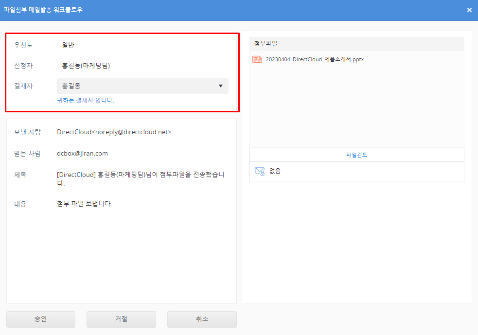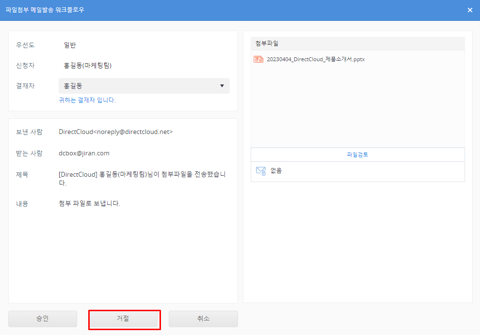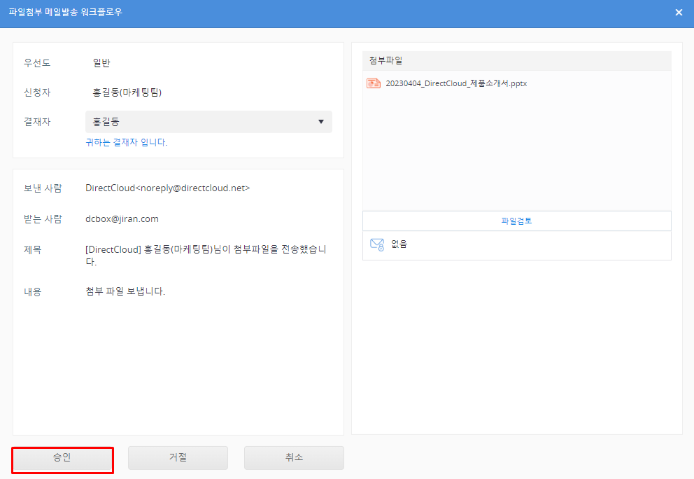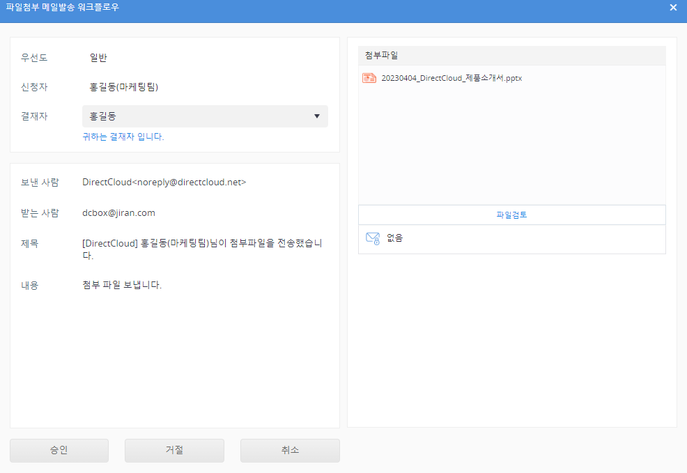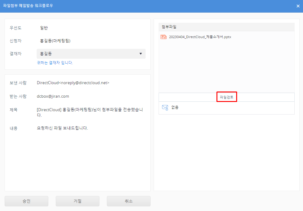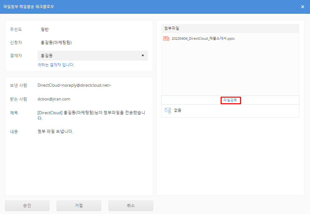 DirectCloud 드라이브에서 파일첨부 메일발송 워크플로우 승인/거절