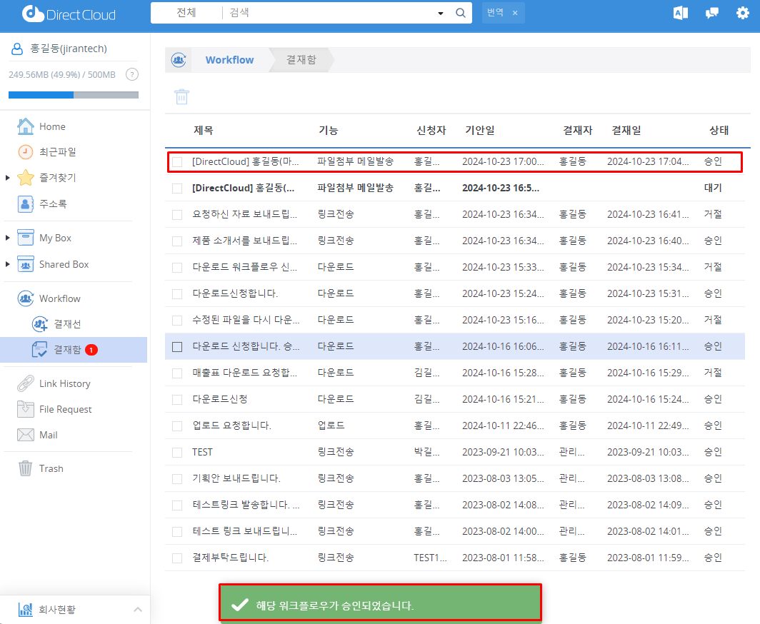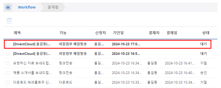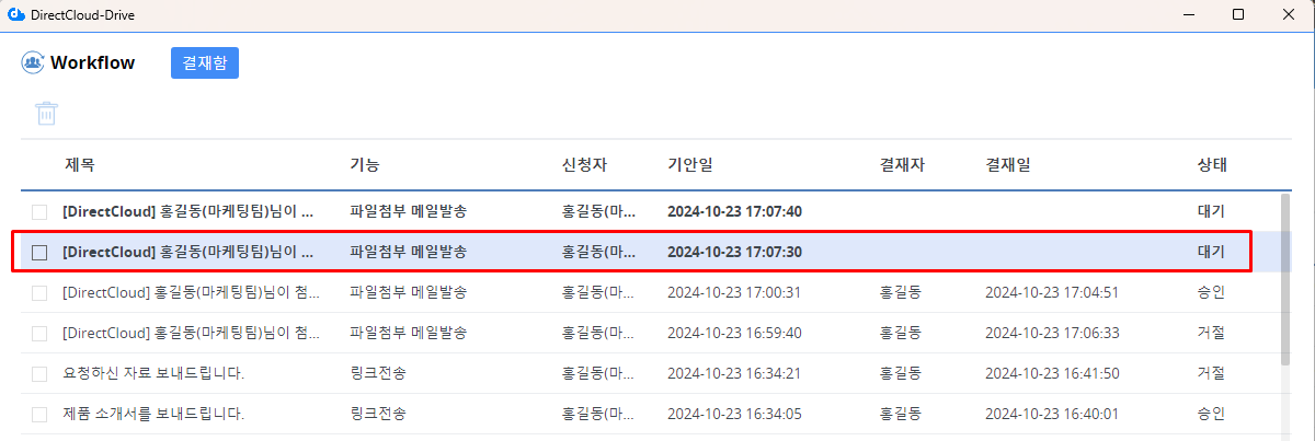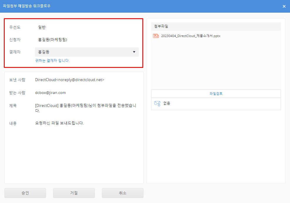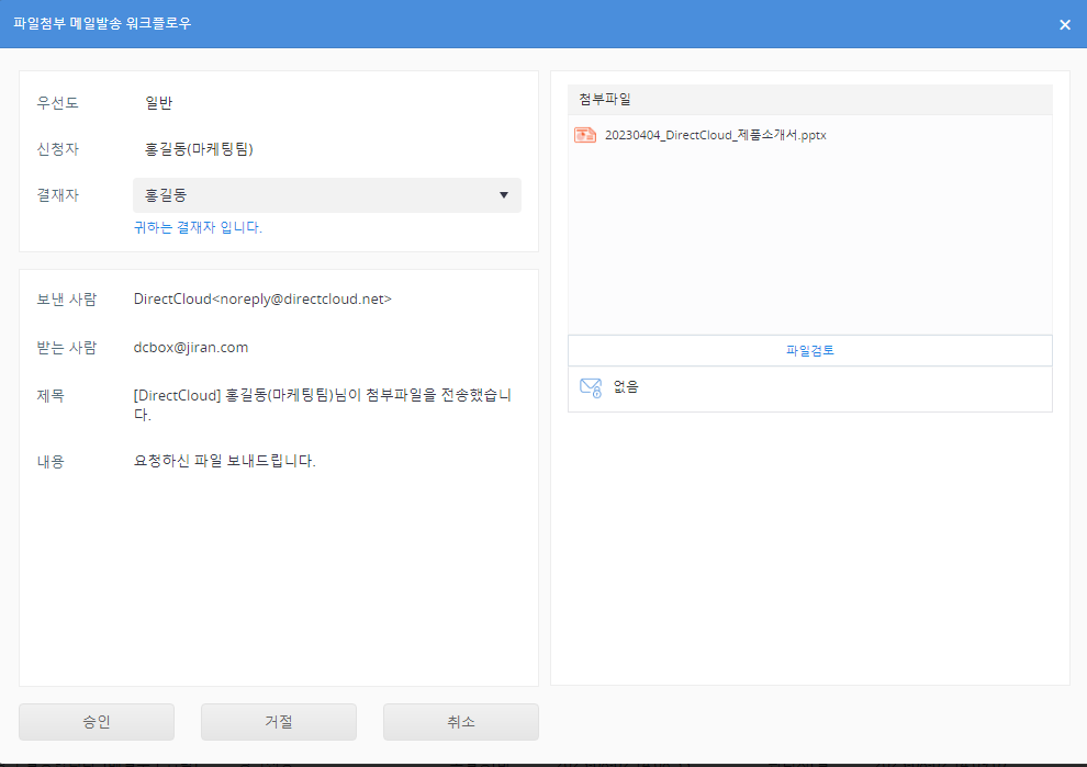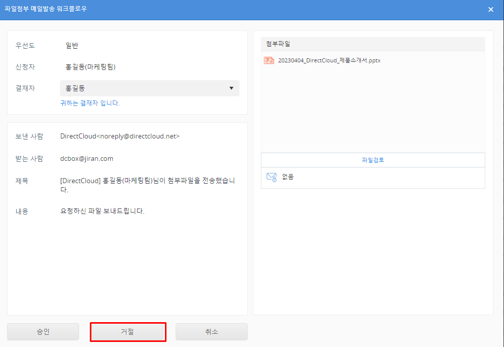DirectCloud 드라이브에서 파일첨부 메일발송 워크플로우 승인/거절