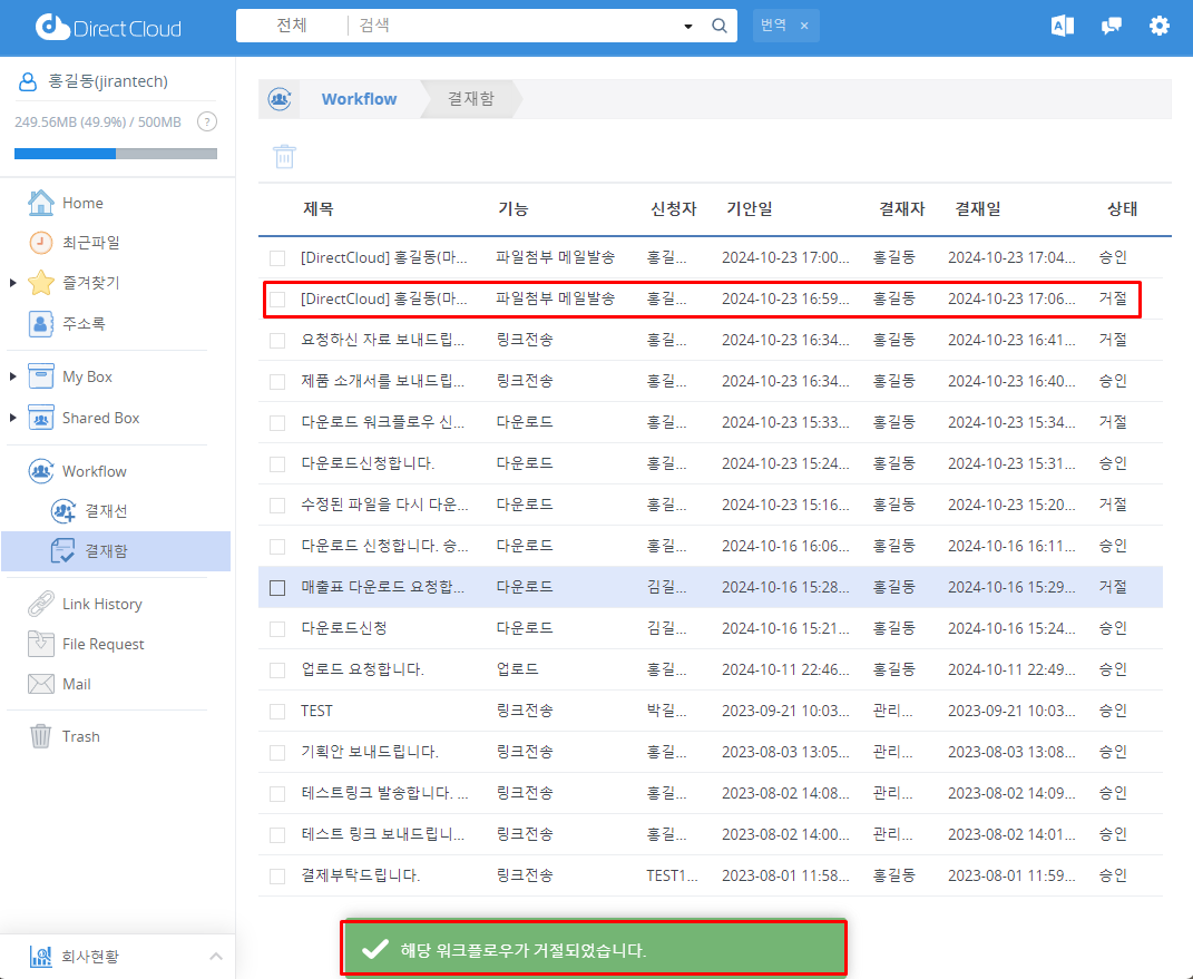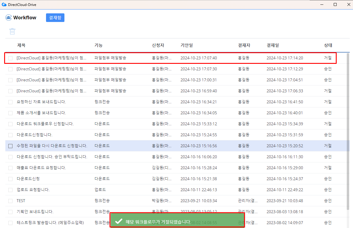 신청이 거부되고 "해당 워크플로우가 거절되었습니다."라는 메시지가 표시됩니다. 또한 상태가 '거절'로 변경됩니다.