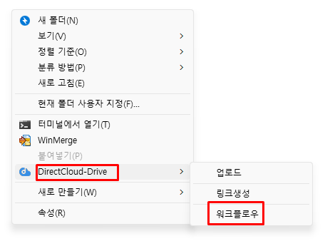 DirectCloud 드라이브의 Shared Box 폴더 등을 마우스 오른쪽 단추로 클릭하고 나타나는 메뉴에서 'DirectCloud-Drive' > '워크플로우'를 클릭합니다.