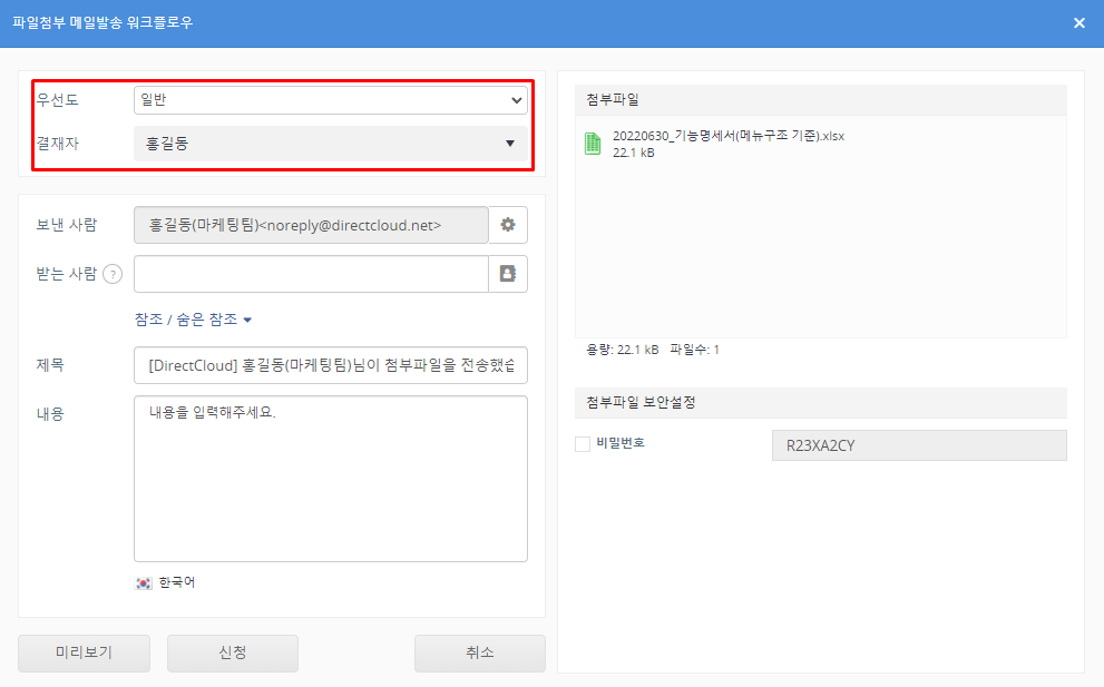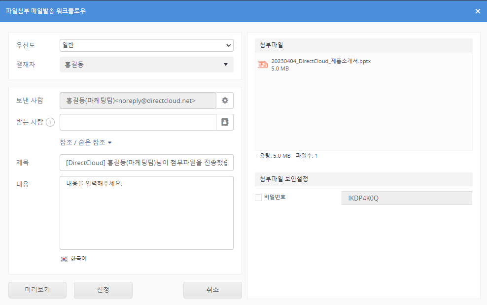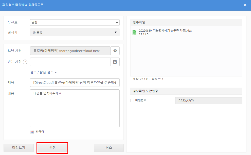 파일첨부 메일발송을 설정하고 '신청' 버튼을 클릭합니다. ‘제목’란에 입력한 내용은 ‘Workflow’>‘결재함’ 메뉴에 표시되는 신청 제목으로 사용되며, 신청이 승인된 후 ‘받는사람’란에 입력한 이메일 주소로 발송되는 링크 메일의 제목으로도 사용됩니다. 신청이 승인된 후에는 제목을 변경할 수 없습니다.