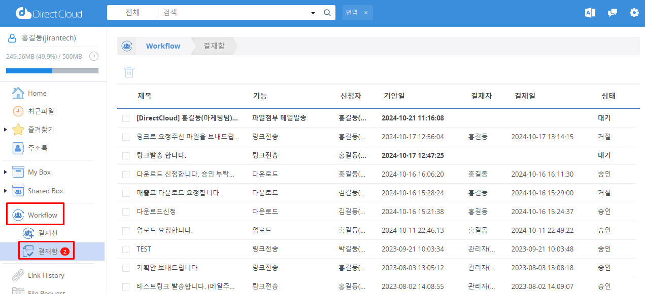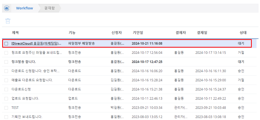 Workflow > 결재함 메뉴를 클릭합니다.