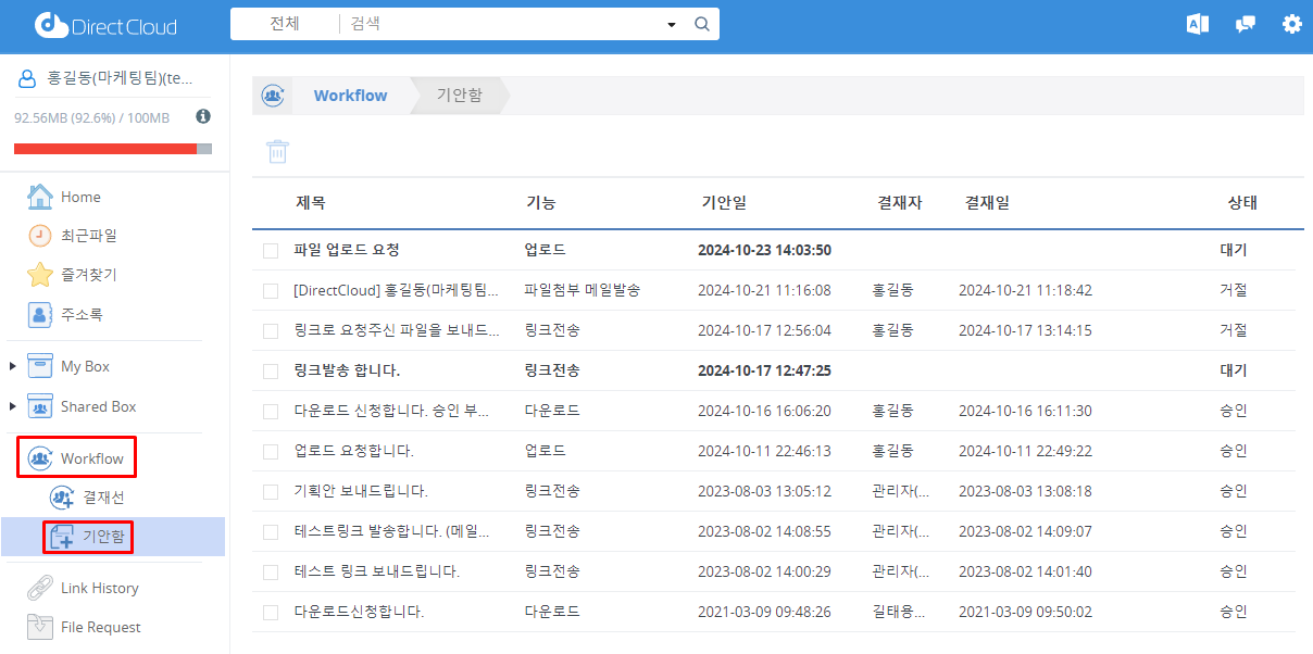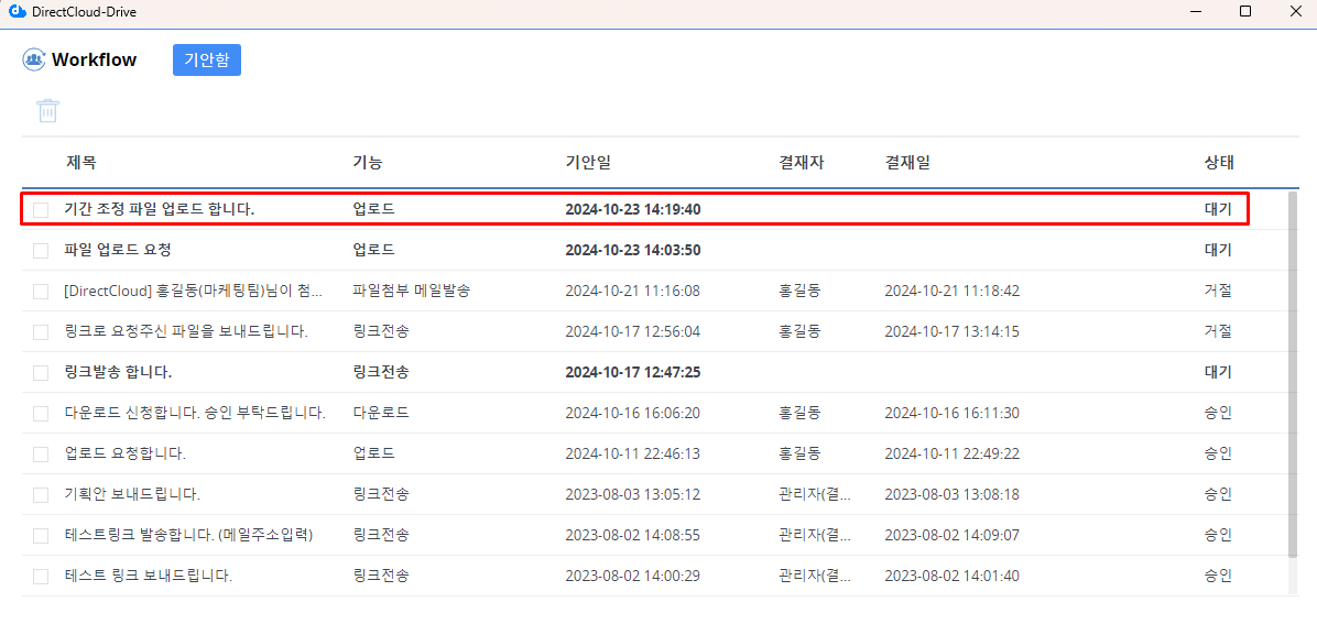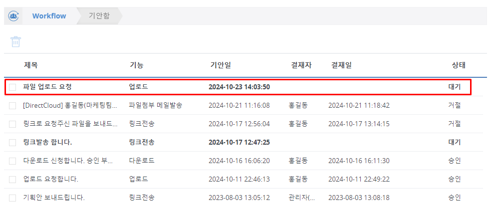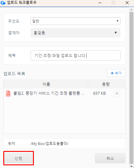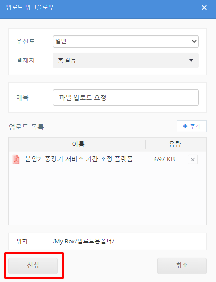 DirectCloud 드라이브에서 업로드 워크플로우 신청