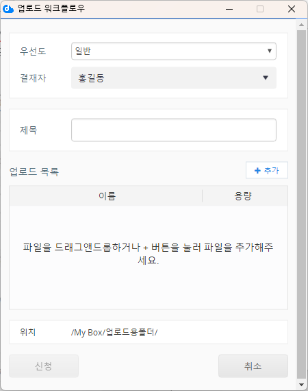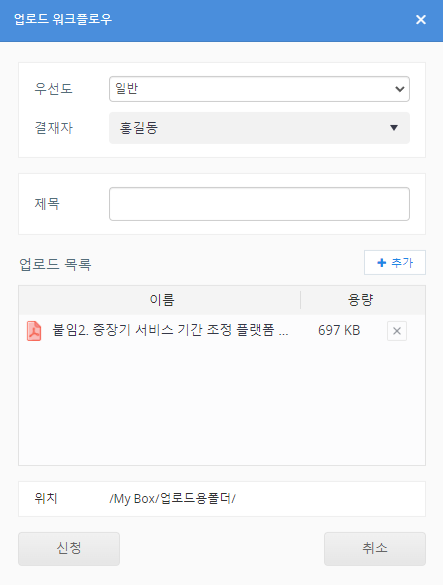 업로드 워크플로우가 생성된 경우 신청자로 설정된 사용자가 파일을 업로드하려고 하면 '업로드 워크플로우 신청' 화면이 표시됩니다.