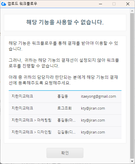 워크플로우에서는 단일 파일 또는 용량 합계가 10GB를 초과하는 파일(모바일 애플리케이션의 경우 300MB)은 업로드 결재를 신청할 수 없습니다.