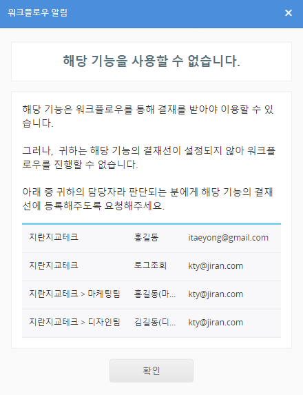 관리 페이지에서 '워크플로우'가 '사용' 으로 활성화되어 있더라도, '공유설정'->' Shared Box 관리' 에서 '워크플로우'가 사용안함’으로 되어 있는 경우, 선택한 폴더에서는 워크플로우를 사용할 수 없습니다.