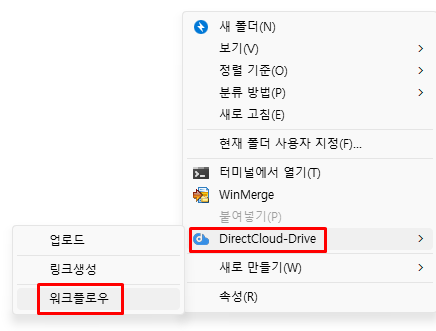 DirectCloud 드라이브의 Shared Box 폴더 등을 마우스 오른쪽 단추로 클릭하고 나타나는 메뉴에서 'DirectCloud-Drive' > '워크플로우'를 클릭합니다.