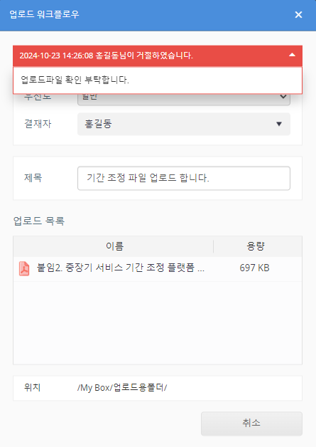 워크플로우에 설정된 결재자 또는 대리 결재자에게 신청이 승인되면 파일이 자동으로 업로드됩니다. 신청이 거부되면 '업로드 워크플로우 신청' 화면에 표시된 메시지 'ㅇㅇ 님이 거절하였습니다.' ▼를 클릭하면 결재자 또는 대리 결재자가 신청을 거절할 때 입력함 이유를 확인할 수 있습니다.